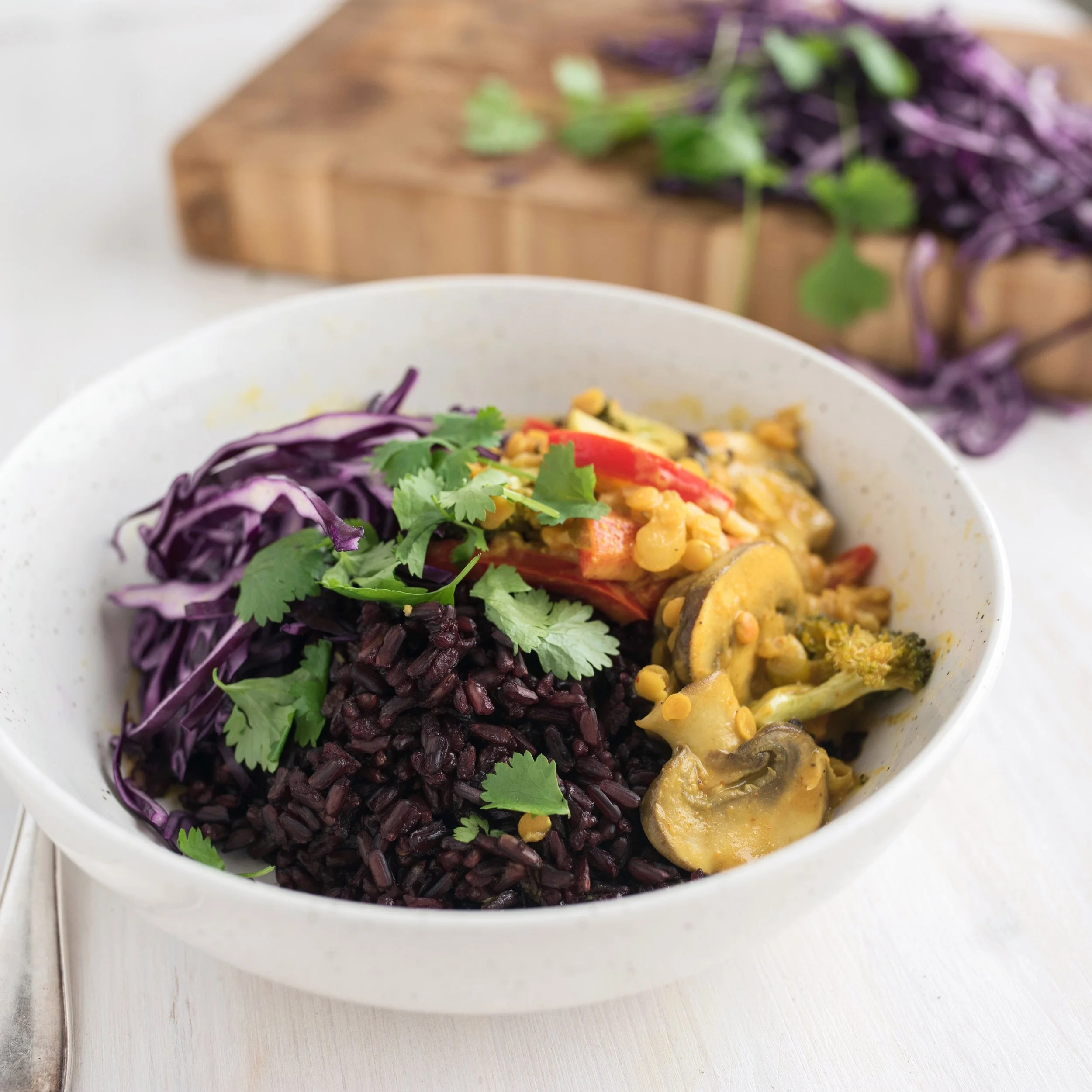 - Serve with rice and top with some red cabbage and coriander. Enjoy!