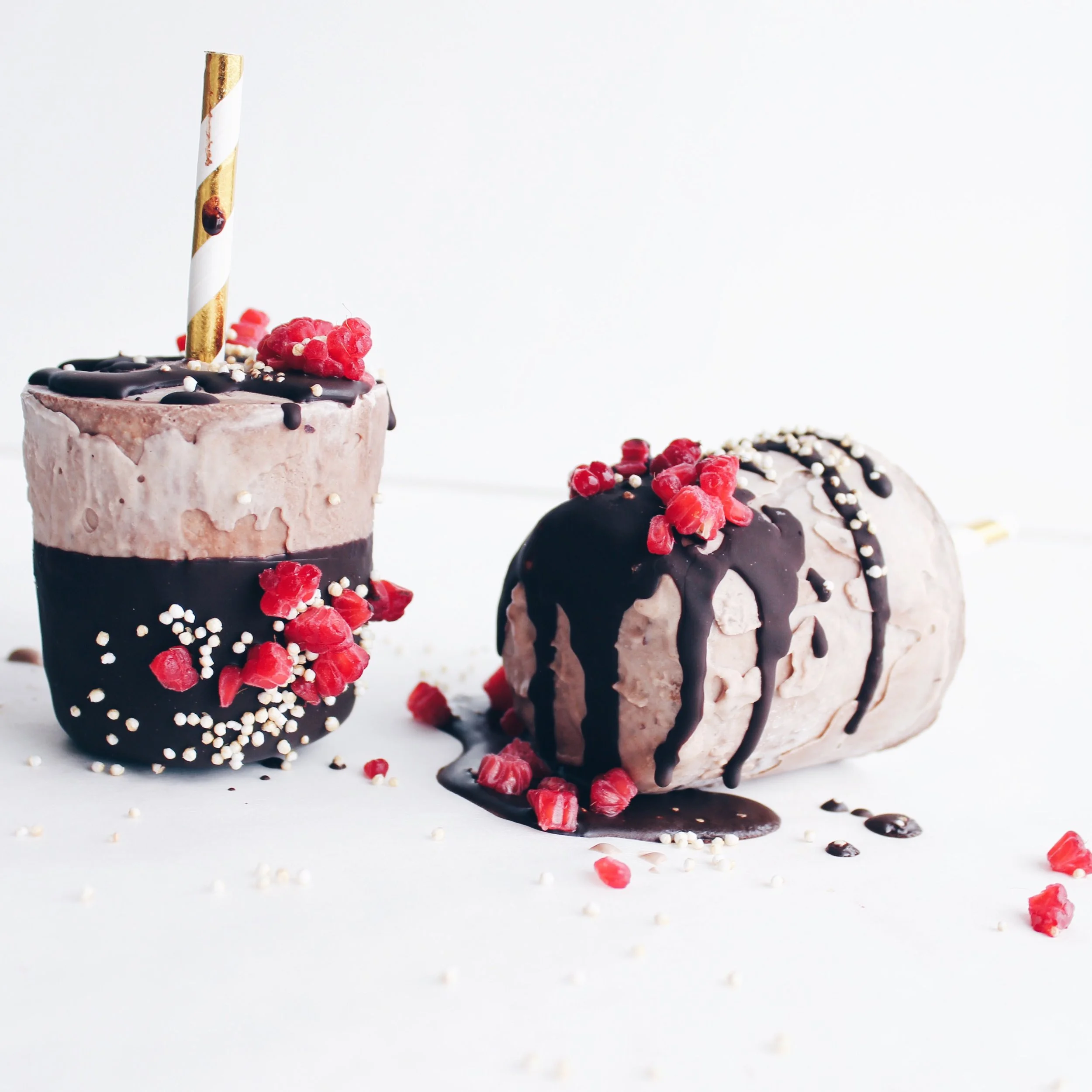 - Now dip the ice cream pops in the chocolate sauce and sprinkle with amaranth puffs and raspberries. Time to Serve!